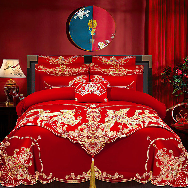 新婚庆四件套大红全棉刺绣结婚房嫁喜被龙凤纯棉六十件套床上用品,卖家好百年婚庆生活馆,