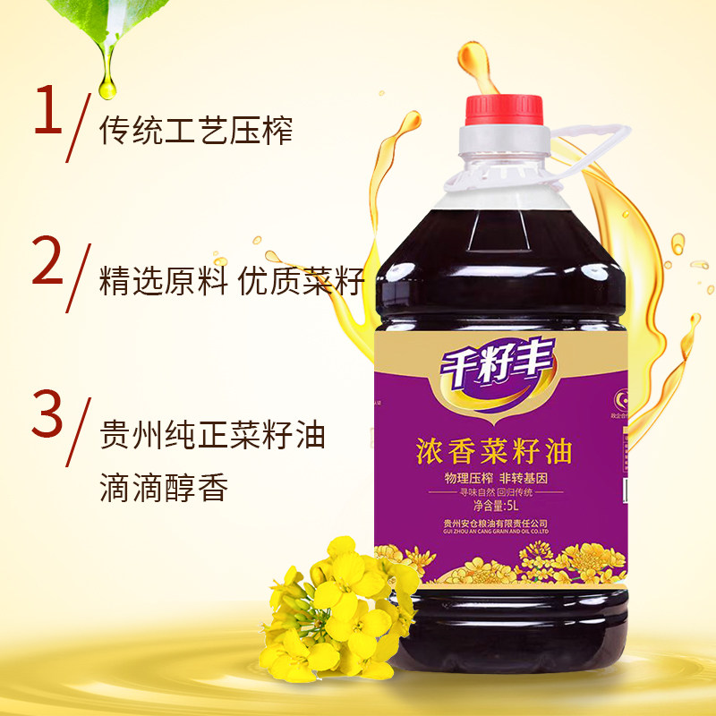 贵州千籽丰菜籽油农家小榨低芥酸纯香压榨正品5L/2.5L食用油5浓香,卖家天天特卖工厂,贵州千籽丰非转基因菜籽油,人间百味,难低家乡一味,颗粒饱满,二万五千亩黄菜籽基地,增香增味,精选上等好料,榨出特香好油,还原本色本色香,0添加隔氧密封。