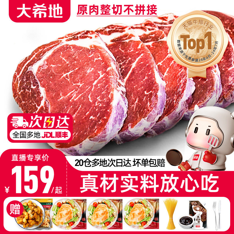大希地家用牛排牛肉原肉整切10片儿童黑椒菲力西冷牛扒官方旗舰店,大希地品牌,卖家大希地旗舰店,【送香煎鸡排80g*25袋+意面100g+酱包160g+刀叉】大希地整切家庭牛排,仅是肉香就能让你疯狂,刚煎好的牛排散发着迷人的香气一口咬下去~饱满的汁水瞬间溢出鲜美跳跃在唇齿间咔哧咔【官旗发货】
