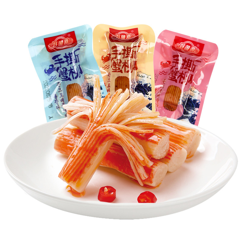 好鱼道手撕蟹柳棒小零食开袋即食蟹肉棒怀旧蟹足棒休闲便携小包装,卖家天天特卖工厂,【详情页淘金币+联盟补贴】好鱼道手撕蟹柳40包*320g,吃一口就爱上!被丝丝蟹香包围的快乐,入口鲜嫩,不腥又香甜!每个都是独立包装,干净便携!
