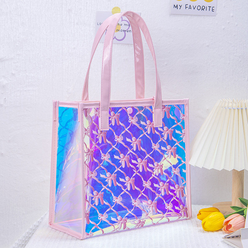 镭射炫彩时尚手提袋新款便携透明手提包女大容量收纳袋通勤托特包。