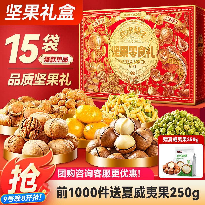 盐津铺子坚果礼盒大礼包零食过年果干休闲食品送礼长辈整箱过年货,卖家盐津铺子食品旗舰店,【年货礼盒】29.9到手15袋坚果礼包,足足1010g!前1000单还加赠250g夏威夷果,合计1260g!闭眼入家人们!这个价格怎么买怎么合适!一次就吃遍盐津家所有热门坚果零食,超值!