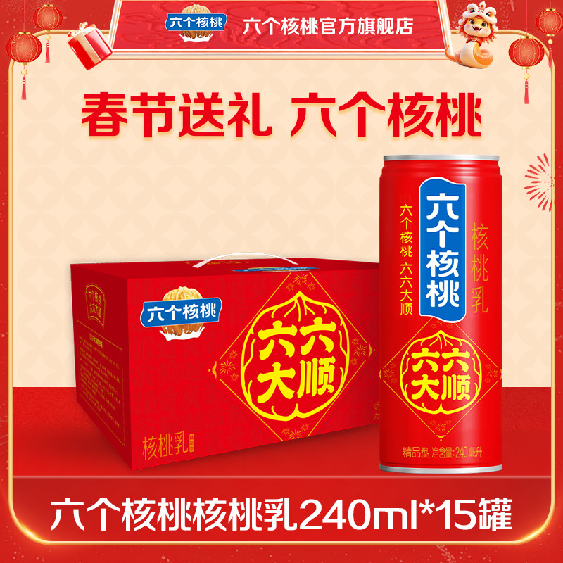 年货礼盒六个核桃旗舰店植物蛋白核桃乳240ml*15罐饮料整箱,卖家六个核桃旗舰店,淘金币抵扣到手47.9左右,过年送礼,就送六个核桃!过年走亲访友必备!六六大顺款,一年热销30亿罐!全新升级低糖配方,原料好、营养好、口感好,春节走亲访友,家家必备!