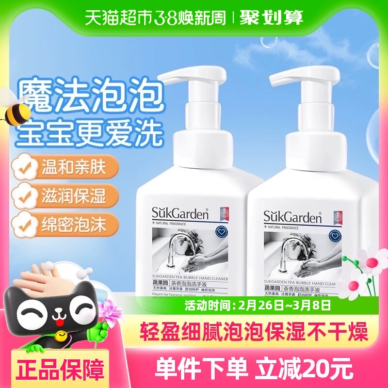 蔬果园茶香儿童泡沫泡泡洗手液宝宝婴幼儿家用滋润保湿不干燥2瓶,卖家天猫超市,茶香型好冲洗,不刺激不拔干。按压泵头超方便,温和绵密泡沫,洗完手也不拔干!清新茶香,轻松除异味。温和配方滋润呵护不伤手,大人小孩都能用!