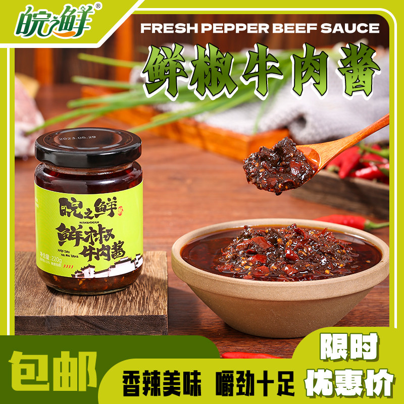牛肉酱鲜椒酱香辣拌饭拌面酱下饭香菇酱辣椒酱调味品辣酱蘸酱辣酱,皖之鲜品牌,卖家皖之鲜旗舰店,【首单+签到】超市一瓶卖15.8元,咱们三瓶任选仅个位数直接到手!辣中带香,香而不辣,鲜辣下饭,香辣有嚼劲,大块肉粒,新鲜笋尖和香菇,口感丰富,好吃看的见!拌饭、拌面,调凉菜绝绝子。