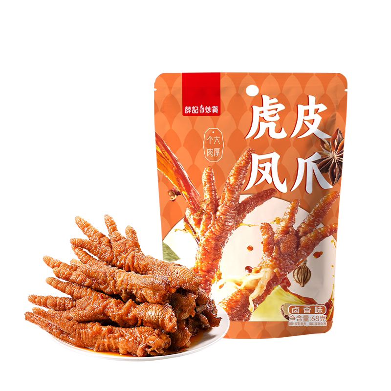 薛记炒货 虎皮凤爪68g/袋香辣味卤香味熟食卤味零食,卖家薛记炒货旗舰店,任选5袋29.9元!薛记炒货卤味虎皮凤爪,香辣熟食鸡爪,软糯化骨,鲜香美味,皮酥多汁!每一口都让你爱不释手,精细挑选,取材考究,多道工艺!色香味俱全,好吃的根本停不下来!【赠运费险】