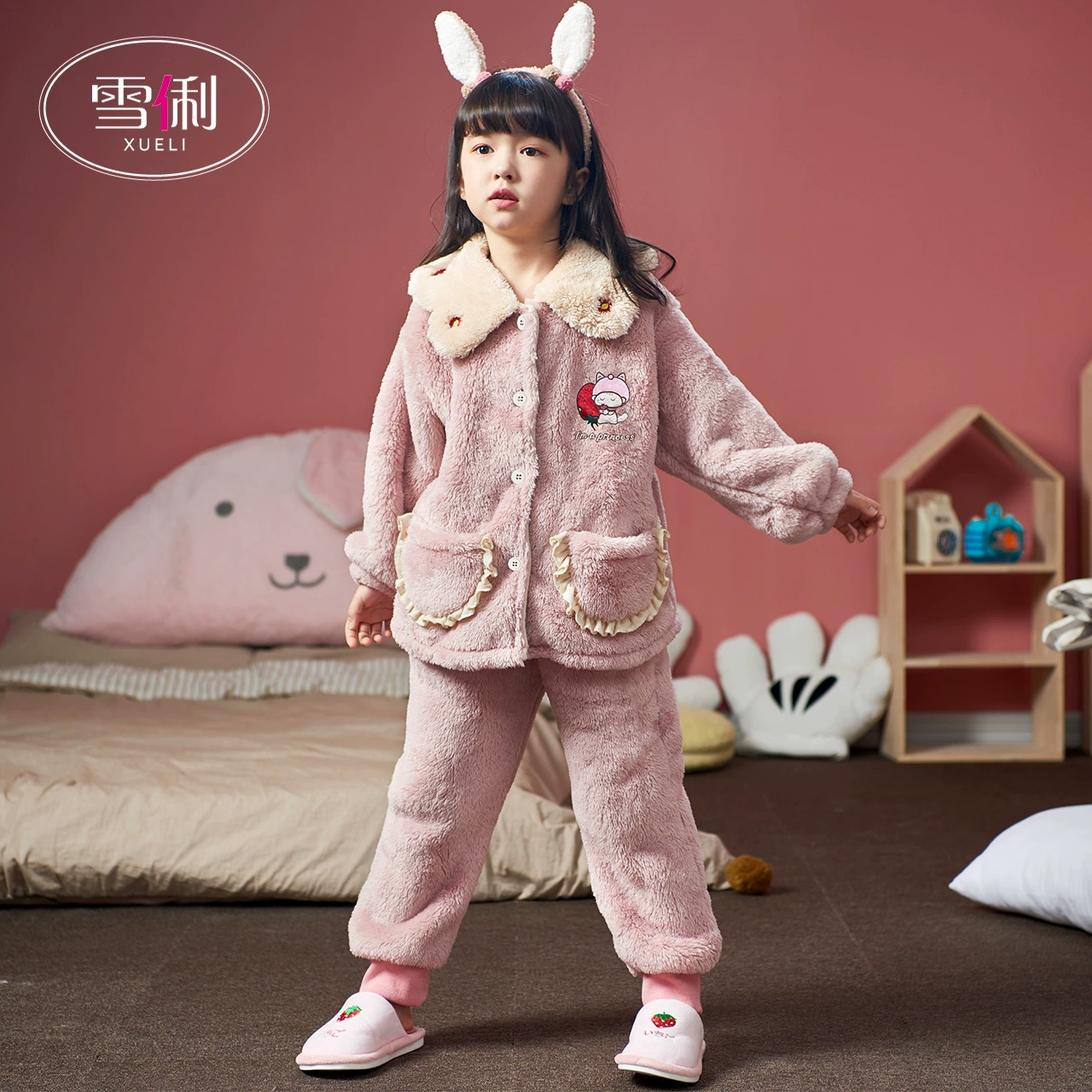 雪俐珊瑚绒法兰绒儿童宝宝睡衣,女童秋冬冬季家居服小童大童套装