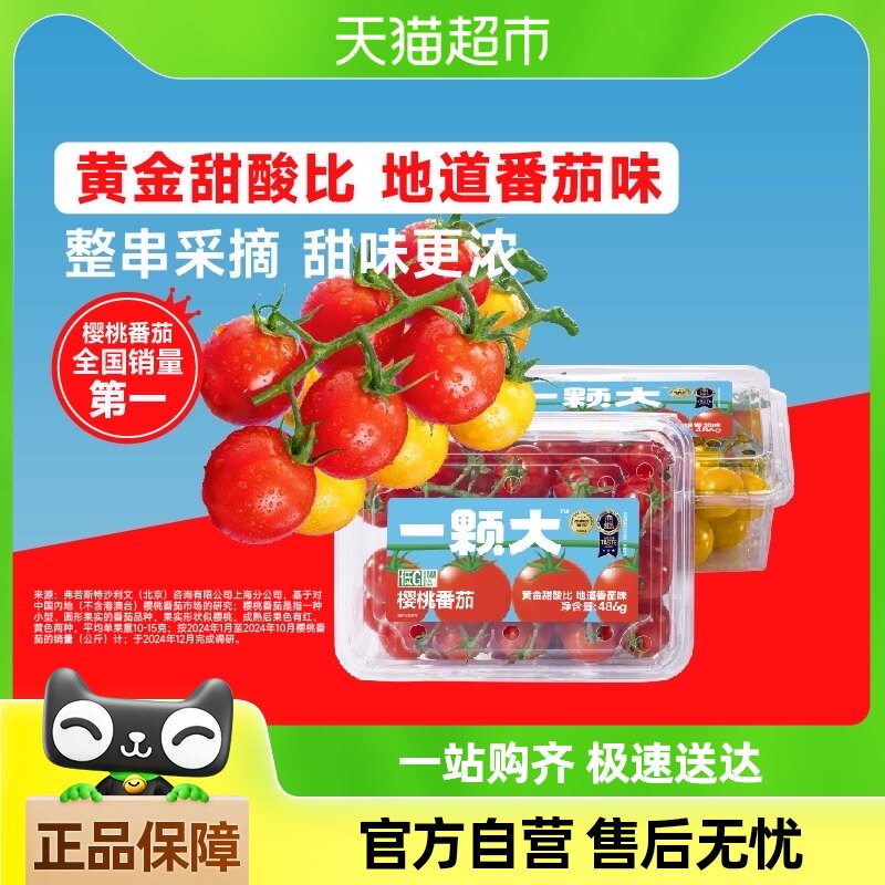 香菇来了一颗大红黄组合樱桃番茄486gx4盒装酸甜多汁新鲜采摘,卖家天猫超市,带枝采摘帮助糖分积累,饱满鲜甜与微酸碰撞,果汁含量翻倍,一口一颗,满口满足!