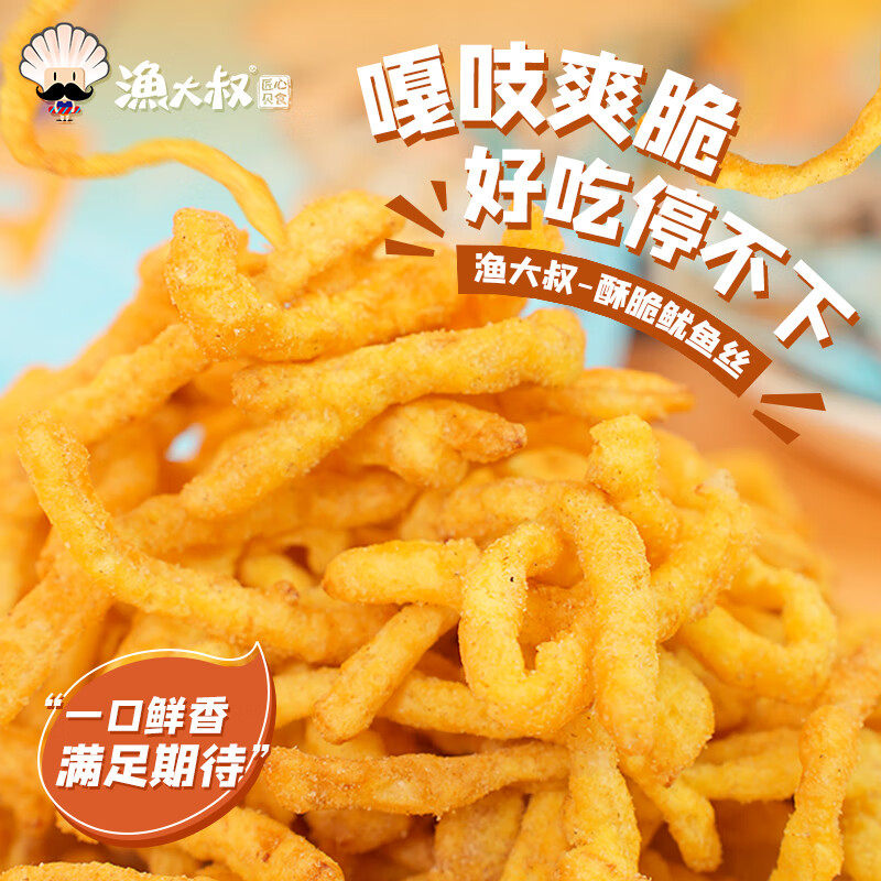 渔大叔油炸鱿鱼丝芥末味脆皮鱿鱼条即食大连特产儿童孕妇海鲜零食,卖家国货严选旗舰,礼金+金币,下拉到手13【渔大叔】天妇罗油炸鱿鱼丝,含量高达61.9%,脆皮鱿鱼条,开袋即食,蟹黄味芥末味香辣味,大连特产,儿童孕妇海鲜零食!