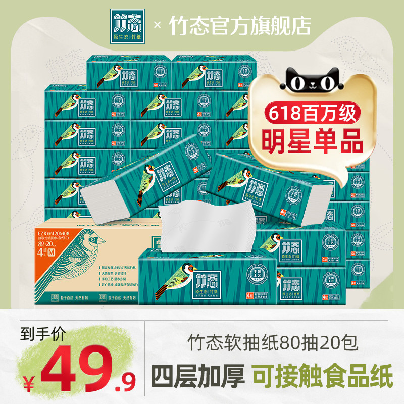 竹态抽纸象牙白80抽20包4层加厚面巾纸整箱家用餐巾纸家庭装纸巾,竹态品牌,卖家竹态旗舰店,可叠加首单礼金【到手41.9】0添加、0漂白的有机生态抽纸!放心接触肌肤!柔韧不掉屑!柔软呵护备至,高品质生活用纸!
