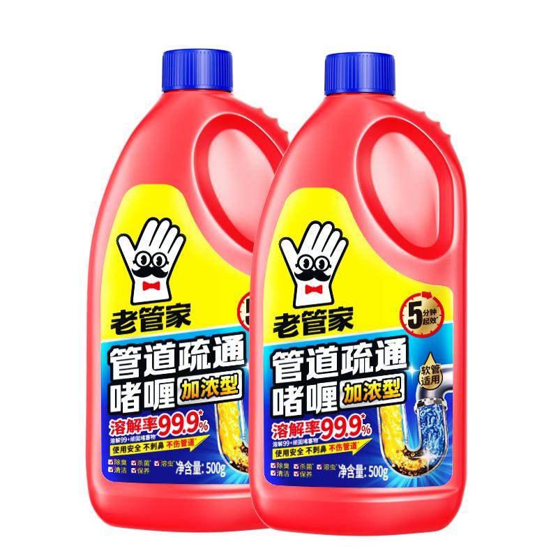 【超级立减•聚划算】【淘金币抵1.49元,满2件9折】老管家管道疏通啫喱500g*2瓶【到手价:33.47=49.90(优惠前)-13.10(秒杀直降)-1.49(淘金币)-1.84(88VIP)】溶解99种以上常见堵塞物,不伤管道,持久养护,杀菌•除臭!!!