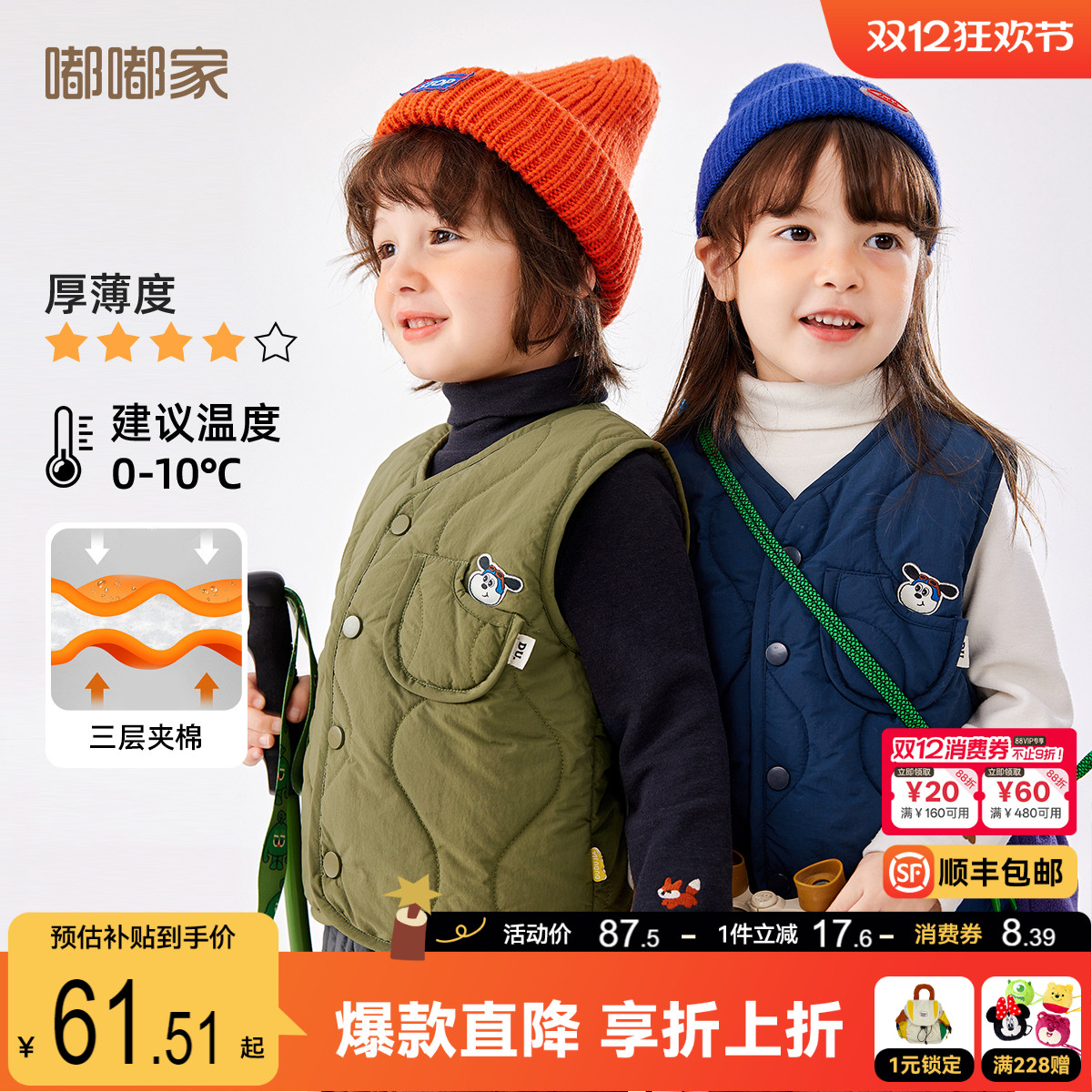 嘟嘟家儿童马甲冬季外穿宝宝背心秋冬男童保暖冬装女童加厚坎肩厚,卖家嘟嘟家官方旗舰店,【无券下单+淘金币,88VIP叠加双12消费券160-20到手预估55.6左右!!】嘟嘟家儿童马甲冬季外穿宝宝背心秋冬男童保暖冬装女童加厚坎肩厚。