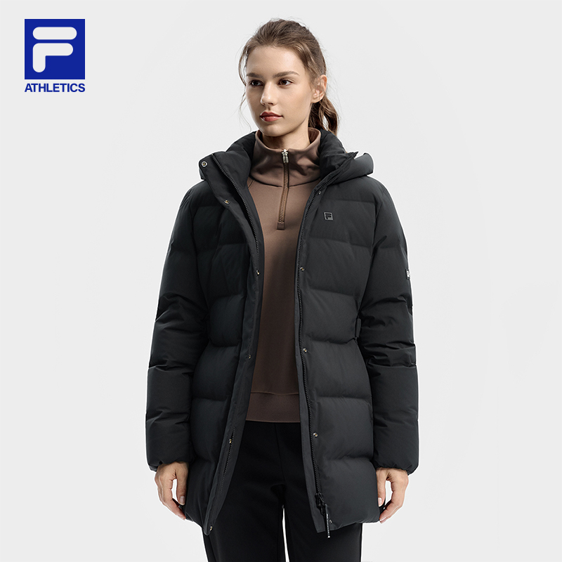 FILA斐乐官方女士中长款羽绒服2025冬新款健身运动保暖连帽外套。