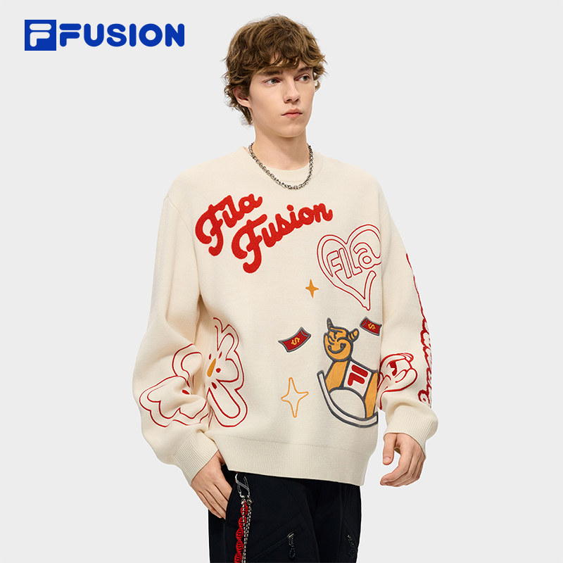 FILA FUSION斐乐潮牌女子编织衫2026春季新款红色新年情侣毛衣男,卖家FILA FUSION官方旗舰店,以俏皮活力的MOFFY小木马为灵感承载传统钱币与红包元素,并搭配幸运四叶草寓意新年"事业马上成、财富马上来、好运马上到"三重好运元素叠加让你新岁走哪都自带好运气场