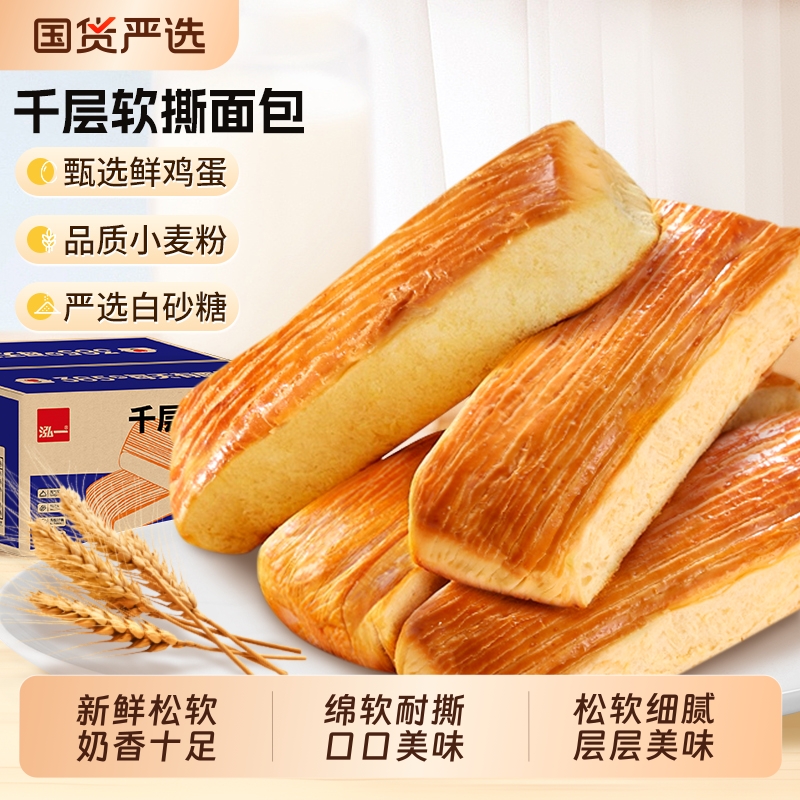 泓一千层手撕面包整箱早餐面包办公室休闲下午茶点心宿舍解馋零食,卖家国货严选旗舰,新鲜松软,奶香十足,绵软耐撕,口口美味,早餐面包办公室休闲下午茶点心宿舍解馋零食