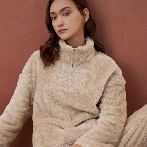 HSIA遐家居服女冬季立领套头舒棉绒宽松长袖直筒长裤保暖睡衣套装,卖家遐内衣旗舰店,【前一千件50%,明天服饰补贴20%礼金,凑满200-25消费券,淘金币抵扣5.97元,到手117元左右。】本系列优选双面舒棉绒绒面蓬松细密,轻柔保暖半开襟款式设计时尚简约,增加外穿性~