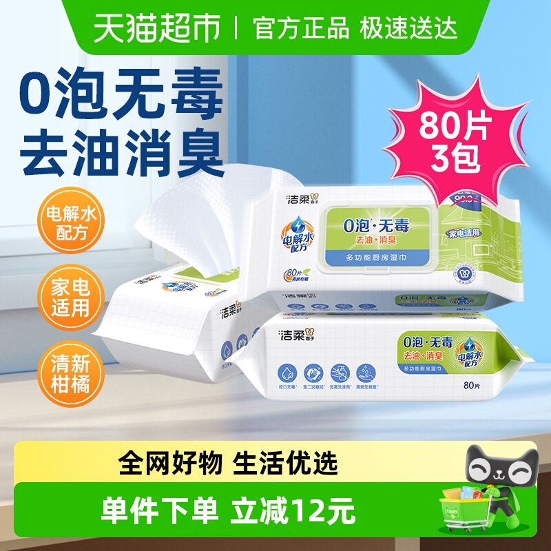 包邮洁柔面子多功能厨房湿巾0泡无毒去油消臭80片3包家电适用,卖家天猫超市,下拉详情页淘金币频道进去拍!88vip到手38.01!洁柔面子多功能厨房湿巾无毒去油80片*3包
