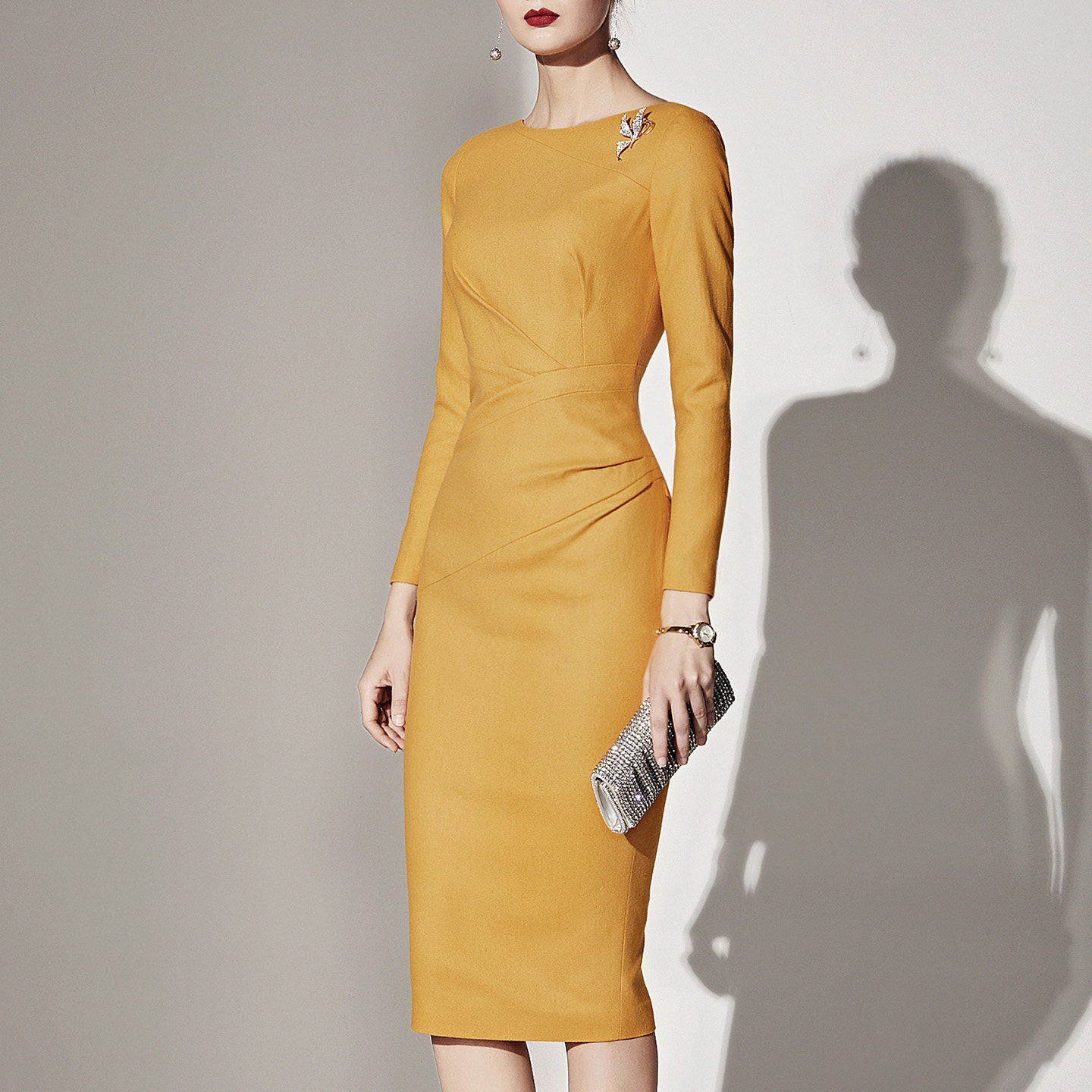春秋季节的必备单品,这款连衣裙采用黄色羊毛呢材质,不仅保暖舒适,更显高贵气质。高腰设计拉长身形,收腰版型凸显女性曼妙身姿。
