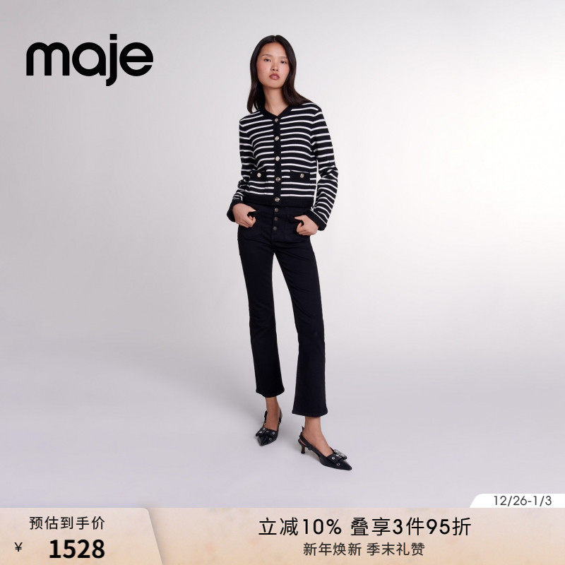 Maje秋冬女装法式时尚气质单排扣黑白条纹短款长袖针织开衫上衣,卖家maje官方旗舰店,【叠加淘金币45元+惊喜消费券35元+首单礼金120元,到手1328元】Maje女装黑白条纹短款长袖针织开衫上衣,超赞~