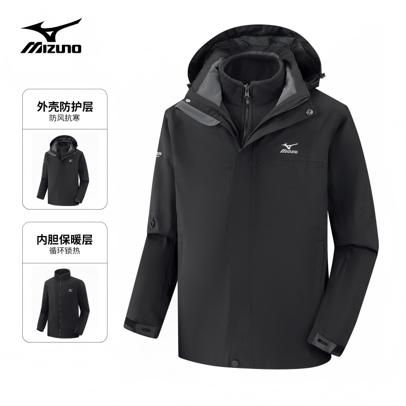 Mizuno/美津浓户外冲锋衣男硬壳,防水防风保暖三合一户外登山外套
