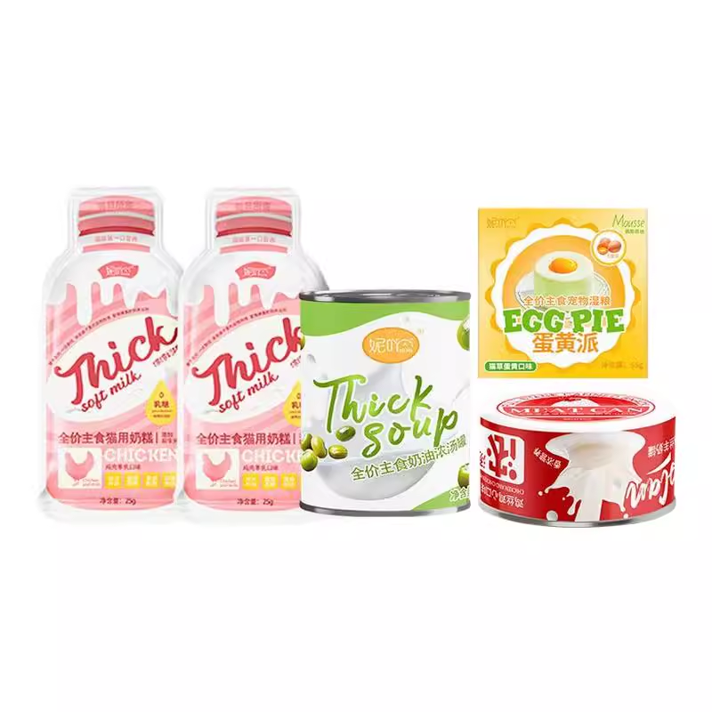 含:妮吖奶油浓汤主食罐、鸡丝羊奶补水罐、主食蛋黄派餐盒,主食奶糕2包