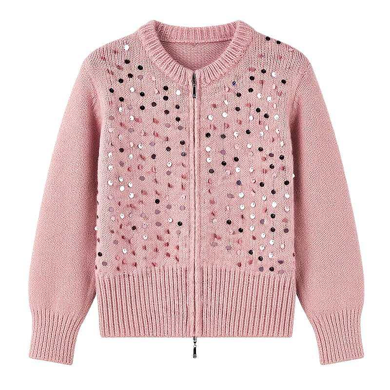 秋水伊人甜美风圆领上衣2025年冬季新款女休闲星点亮片拉链针织衫,