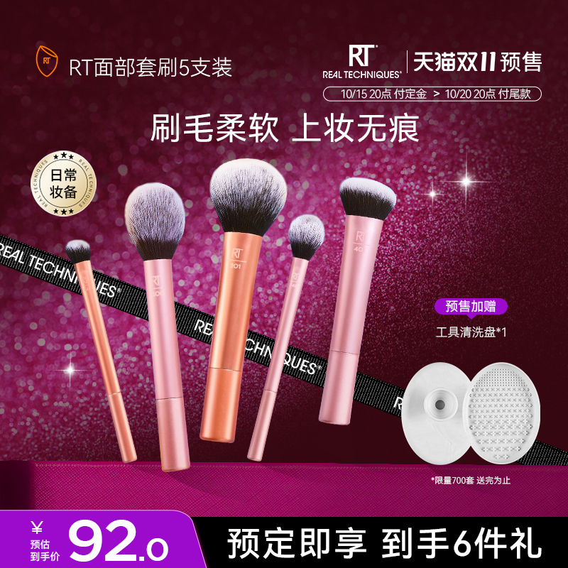 双11预售RT升级版面部化妆刷套装腮红刷定妆刷阴影刷修容刷,卖家RealTechniques旗舰店,页面价格109元,官方立减17元,淘金币件3.27元,叠加9折消费券,79.86元到手5件套~刷毛柔软,上妆无痕~抓粉力强!!