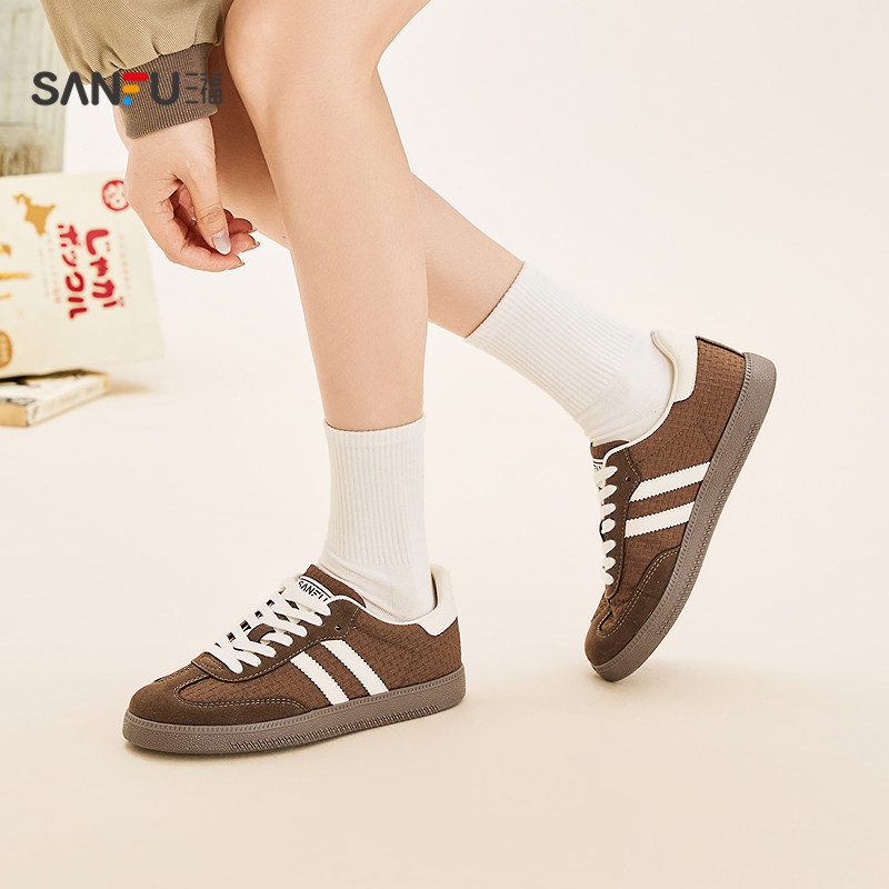 春日出街轻松搭,三福这款女款德训板鞋融合韩系校园风格,低帮圆头设计贴合脚型,轻盈舒适。鞋面采用拼接工艺,提升视觉层次感,同时增强透气性,适合日常通勤或校园穿搭。经典德训鞋型百搭不挑人,兼顾休闲与时尚感,是春季换季鞋柜里的实用选择。