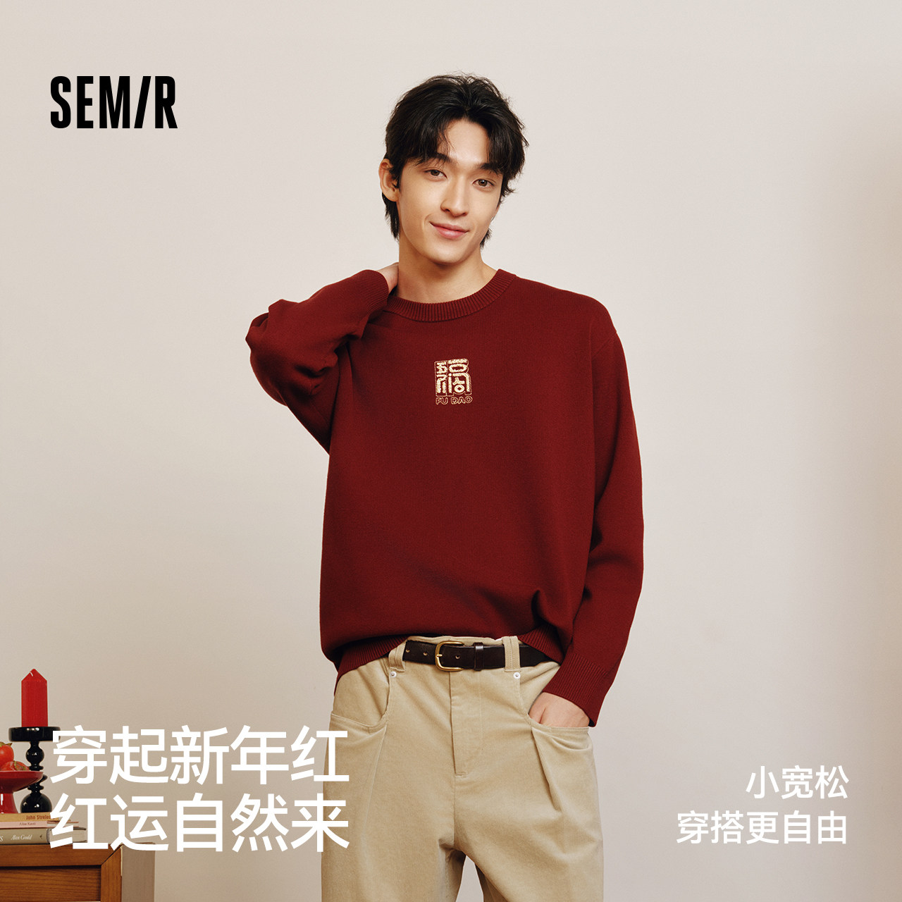 森马张仁华非遗联名毛衫男春季五福图案针织衫小宽松套头圆领毛衣!!