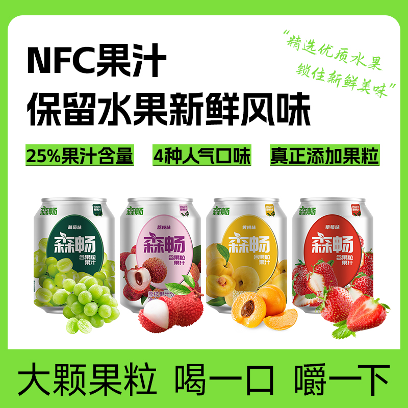森优森畅葡萄NFC果汁饮料草莓荔枝黄桃多口味果粒果肉饮品10罐装,卖家森优饮品旗舰店,【单品直降满29减10,首单礼金减1,限时红包减2元,综合到手价26.9元】森优森畅NFC果汁饮料多口味果肉10罐装,超赞!