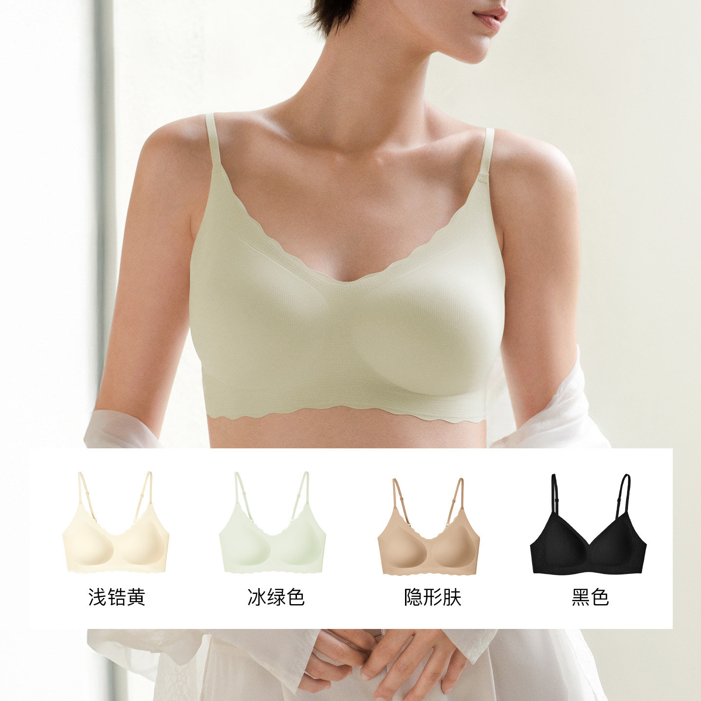 采用无尺码设计,贴合多种身形,穿着无束缚感;浪花细肩带轻盈灵动,提升整体穿搭美感。无钢圈结构搭配高弹透气面料,带来全天候舒适