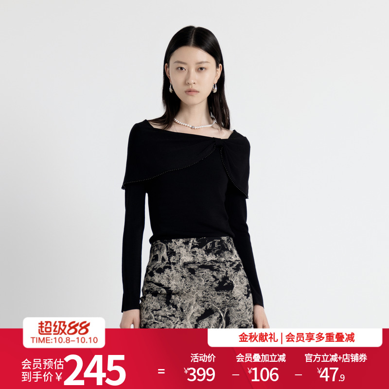 婉甸2025年秋季新品设计感斜肩上衣,珍珠边毛织套头衫1243W11RJ3