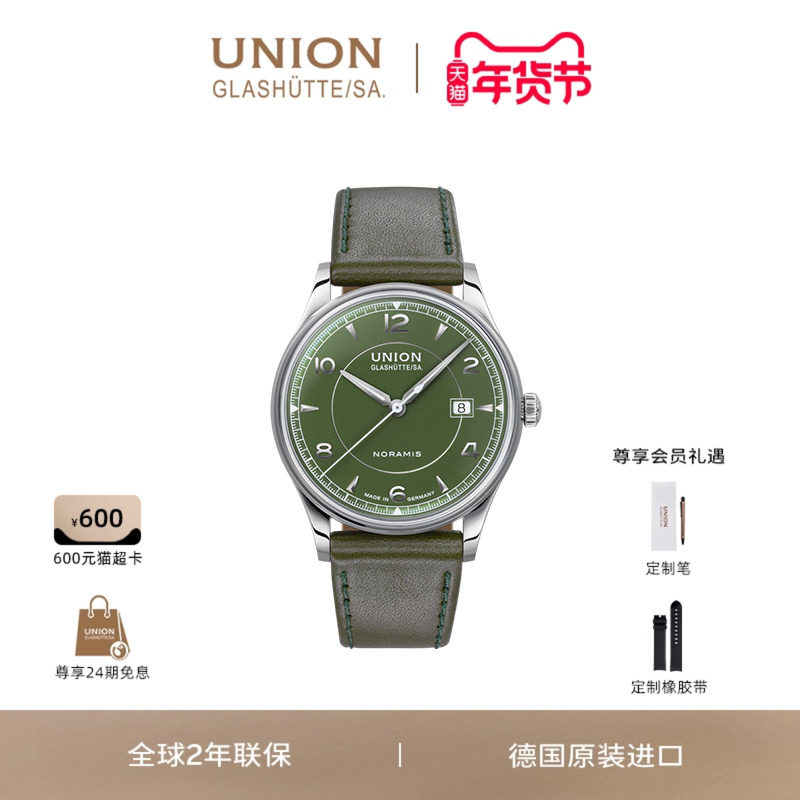 Union格拉苏蒂宇联德国诺拉敏斯绿盘日历男士腕表手表,卖家UNION GLASHUTTE SA宇联官方旗舰店,NORAMISDATE诺拉敏斯系列日历腕表,表盘配色以1970年代复古汽车的车身涂漆为灵感,将复古车身的灵魂色彩与摩登制表技艺相融合,打造行走于腕间的七十年代风格符号!!!