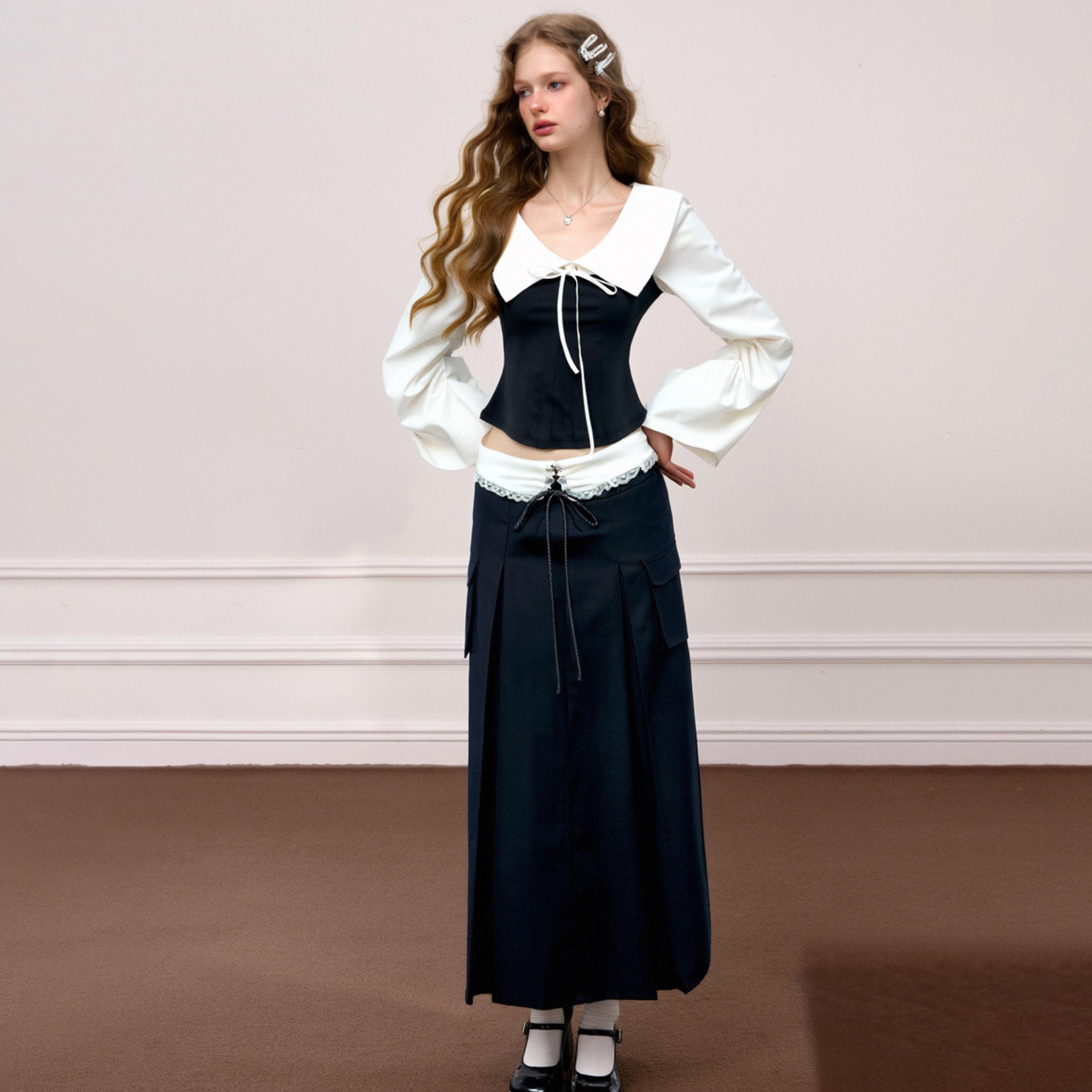 卓芝法式海军领蝴蝶结系带撞色长袖衬衫